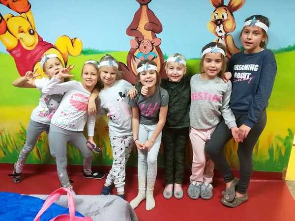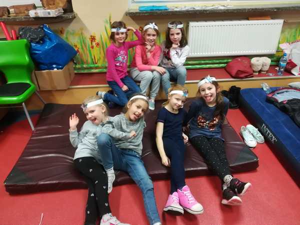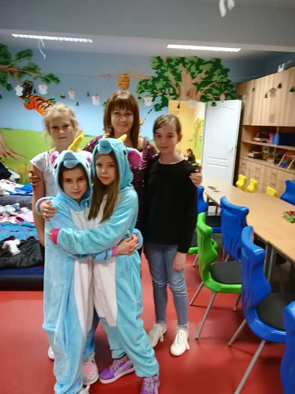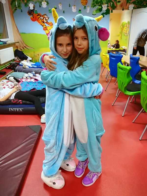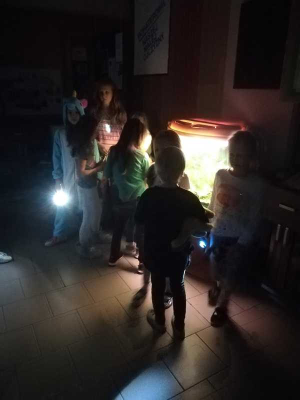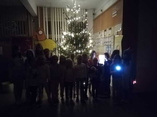 Szykując się do poniedziałkowego kolędowania, Nutki wykonały opaski z gwiazdką, w których wystąpią na koncercie. Bardzo ważnym punktem programu biwaku było przejście z latarkami po ciemnej szkole. Żeby nie było za łatwo, najpierw siedząc w kręgu, opowiadaliśmy sobie bardzo strrrrraszne historie… Dzieci jednak okazały się odważne, zwiedziły szkołę począwszy od piwnicy aż po 2 piętro. Pięknie wyglądały świątecznie przystrojone Białe Błota z okien drugiego piętra. Uroku dodawał padający śnieg. Zajęcia i spacer w ciemności wymęczyły nieco dzieci, jednak zasnąć nikomu się nie chciało. Trzeba było wspomóc się opowiadaniem bajek na dobranoc. Świetna okazała się nasza pani Basia. Myślałam, że dzięki niej, mnie się upiecze, wszak mocniejsza jestem w śpiewaniu i graniu niż w opowiadaniu. Musiałam jednak stanąć na wysokości zadania. Przywołałam więc z czeluści mej pamięci bajkę o Śwince skarbonce i tak wspólnie uśpiłyśmy dzieci. Rano po śniadaniu, dzieci sprawnie zabrały się do pakowania i sprzątania. Rodzice znowu stanęli na wysokości zadania i dwie sale świetlicy zostawiliśmy w takim samym stanie, jak zastaliśmy. Nutki na koniec otrzymały upominki – warsztaciki, ufundowane przez dyrektora naszej szkoły, panią Danutę Ferenstain, za które serdecznie dziękujemy.