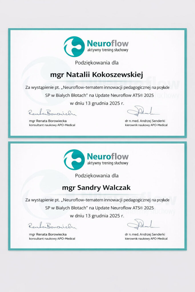 Z dumą informujemy, że dwie nauczycielki naszej szkoły logopeda mgr Sandra Walczak oraz terapeuta Si mgr Natalia Kokoszewska miały zaszczyt wystąpić dnia 13.12.2025r. jako prelegentki na jubileuszowej 10 ogólnopolskiej konferencji „Update Neuroflow®”. Tematem przewodnim konferencji były „Trudności w przetwarzaniu bodźców słuchowych czynnikiem transdiagnostycznym w zaburzeniach rozwojowych”. Swoje wystąpienie pt.: ,, Neuroflow – tematem innowacji pedagogicznej na przykładzie SP w Białych Błotach” poświęciły wdrażaniu nowoczesnych metod wspierających rozwój uczniów, inkluzji oraz innowacyjnych narzędziach edukacyjnych. Podczas wydarzenia, podzieliły się swoją wiedzą, doświadczeniem oraz dobrymi praktykami w pracy z uczniami i rodzicami, zwracając szczególną uwagę na to, jak ważna jest realna współpraca = synergistyczne efekty! inspirując innych pedagogów z całej Polski. To ogromne wyróżnienie i potwierdzenie ich profesjonalizmu, pasji oraz zaangażowania w rozwój nowoczesnej edukacji. Gratulujemy i dziękujemy za godne reprezentowanie naszej szkoły!