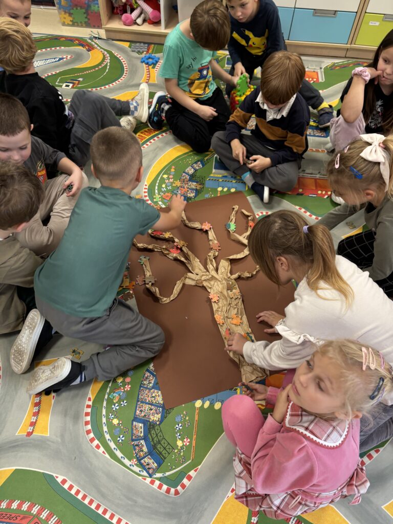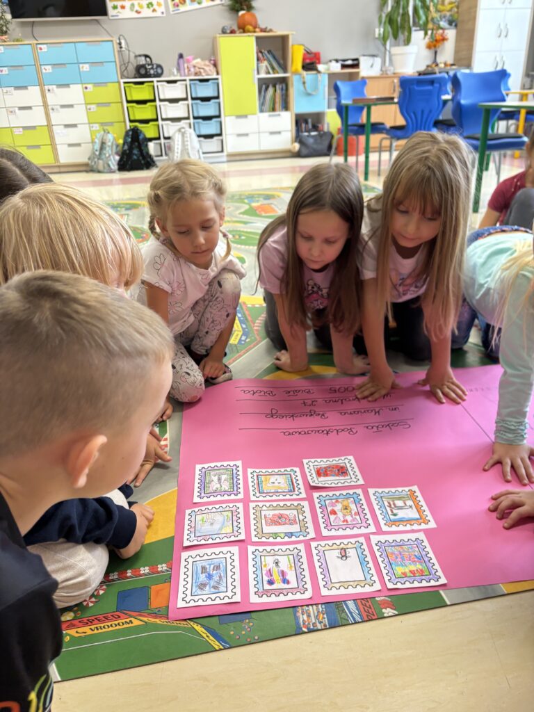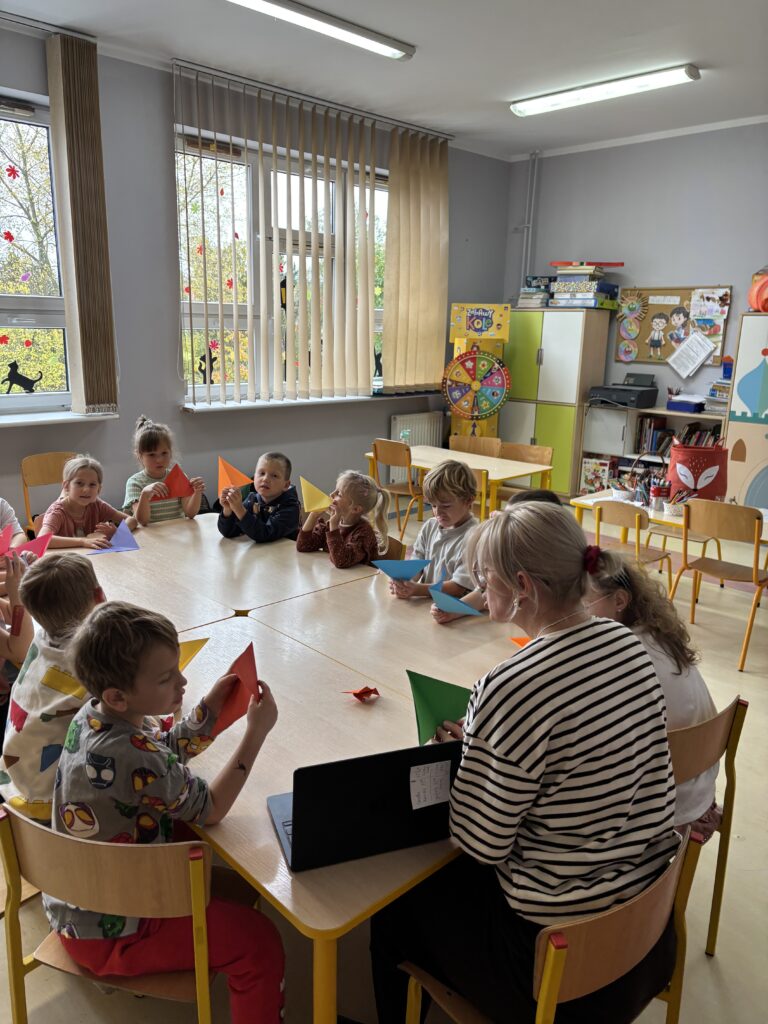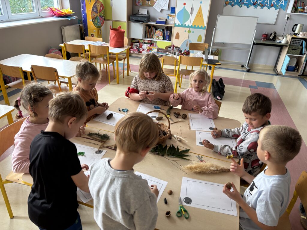 Październik był miesiącem bogatym w różnorodne aktywności artystyczne i integracyjne. W trakcie zajęć dzieci pogłębiały wiedzę o jesiennej przyrodzie, obserwowały zmiany zachodzące w otoczeniu oraz poznawały charakterystyczne dary jesieni. Wykonywały liczne prace plastyczne inspirowane tą porą roku, rozwijając zdolności manualne oraz kreatywność. Odbyły się zajęcia z origami, dzień znaczka pocztowego, dzień kundelka oraz zajęcia z kodowania na macie.