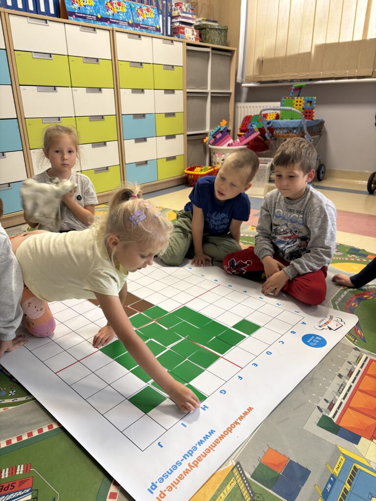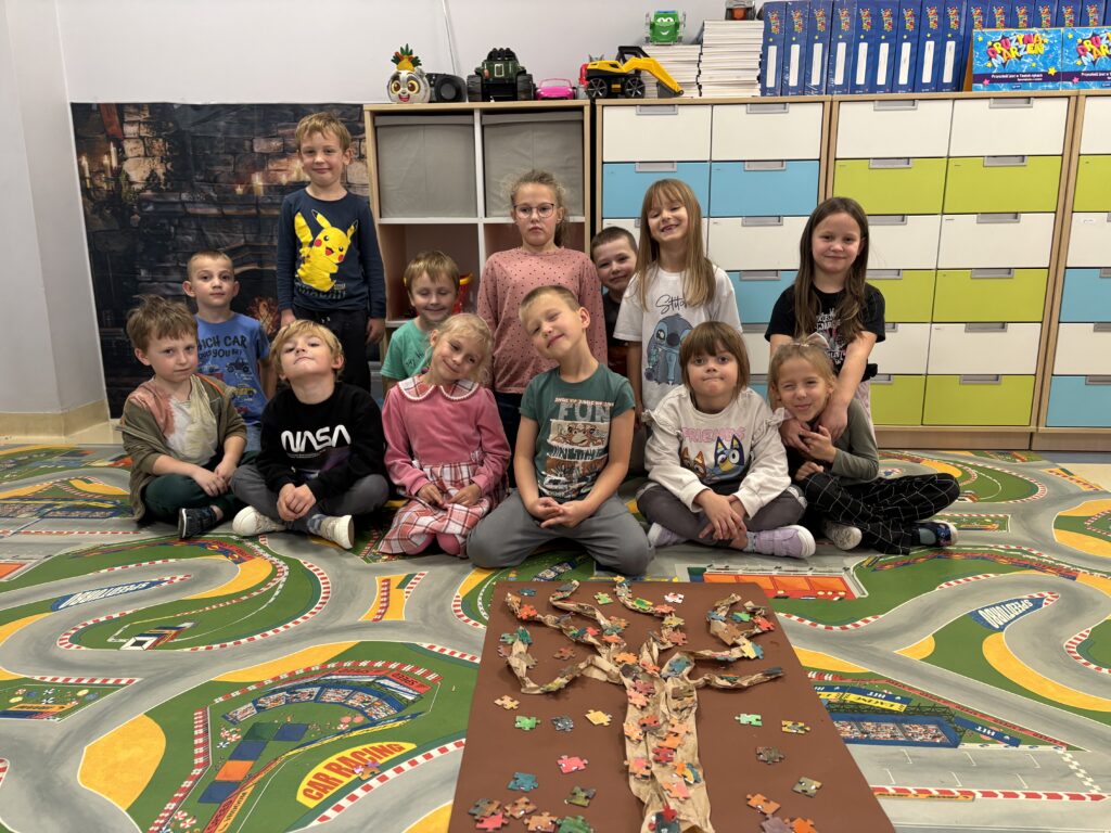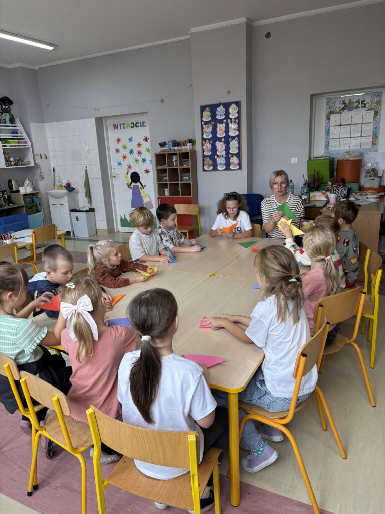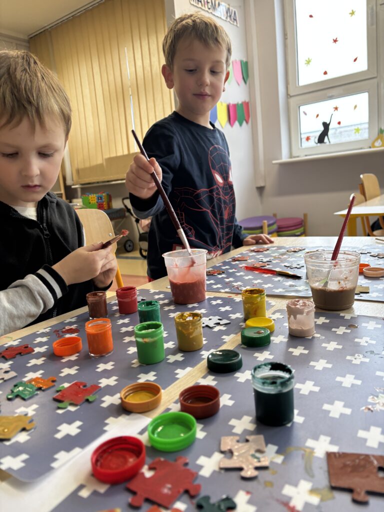 Październik był miesiącem bogatym w różnorodne aktywności artystyczne i integracyjne. W trakcie zajęć dzieci pogłębiały wiedzę o jesiennej przyrodzie, obserwowały zmiany zachodzące w otoczeniu oraz poznawały charakterystyczne dary jesieni. Wykonywały liczne prace plastyczne inspirowane tą porą roku, rozwijając zdolności manualne oraz kreatywność. Odbyły się zajęcia z origami, dzień znaczka pocztowego, dzień kundelka oraz zajęcia z kodowania na macie.